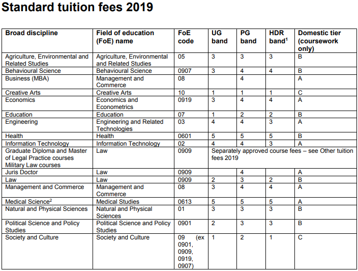 學費費率逐年變化。他們可以因多種原因而改變,包括大學和澳大利亞政府設定的原因。具體的課程費用金額在課程網(wǎng)站上的相關條目中列出。