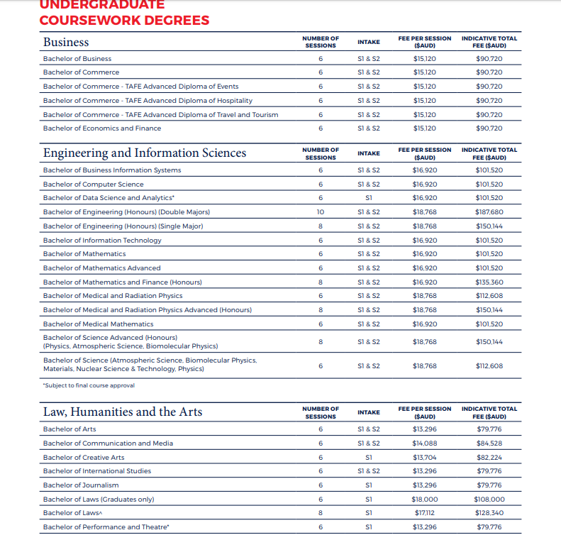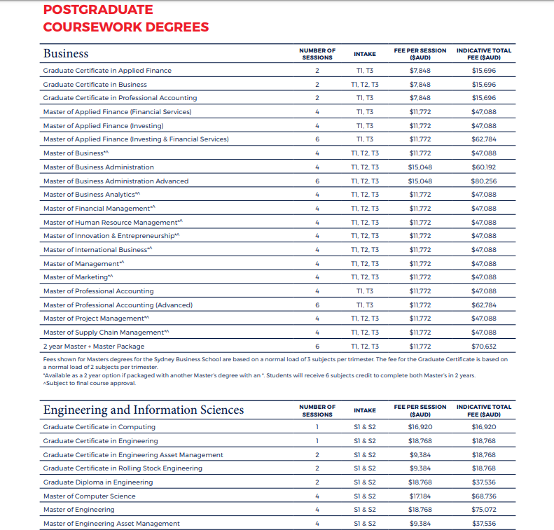 《國際收費手冊》包含了UOW提供的課程的完整列表,顯示了持續(xù)時間、課程數(shù)量(或?qū)W習周期)和學費。