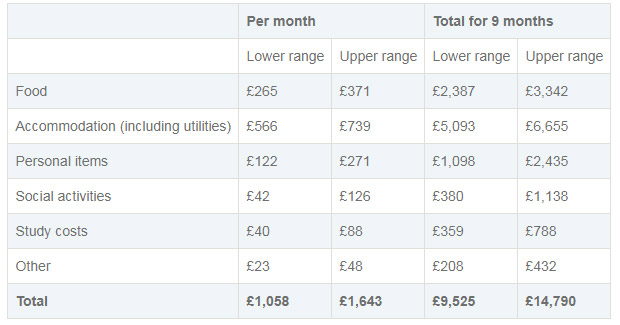 你的生活費用會因你的生活方式而有很大的不同。據(jù)估計,2019-20年期間,這一數(shù)字為每月£1,058--£1,643。本科課程通常由三個學(xué)期組成,每個學(xué)期八周,但作為參考,您最好按照9個月的預(yù)算準(zhǔn)備資金,以確保您在假期期間也有足夠的資金來維持基本生活。